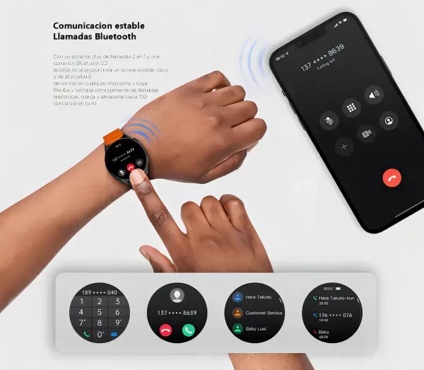 La conectividad Bluetooth permite realizar llamadas directamente desde el reloj, facilitando la comunicación en todo momento. También cuenta con un asistente de voz, recordatorio del periodo menstrual femenino y la opción de tomar fotos a distancia, lo que lo convierte en un dispositivo multifuncional. Con una batería de 330 mAh, disfrutarás de un uso prolongado sin necesidad de recargas frecuentes.