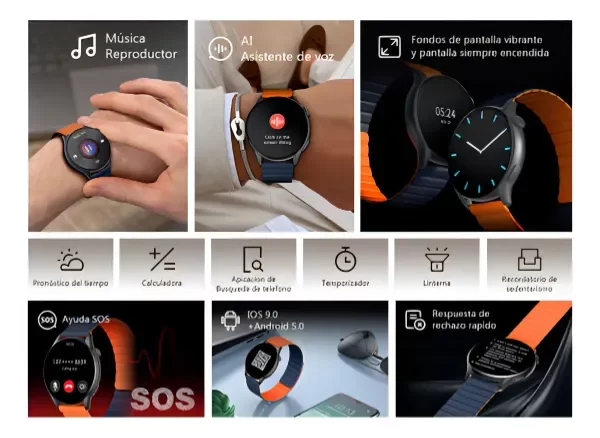 Diseñado para el deporte, este smartwatch cuenta con más de 100 modos deportivos, lo que lo convierte en un compañero perfecto para cualquier actividad física. Además, incluye funciones avanzadas como monitor de frecuencia cardiaca, oxígeno en sangre SP02 y monitor de sueño, brindando un seguimiento integral de tu salud. Su resistencia al agua hasta 30 metros asegura que puedas usarlo en diversas condiciones sin preocupaciones.